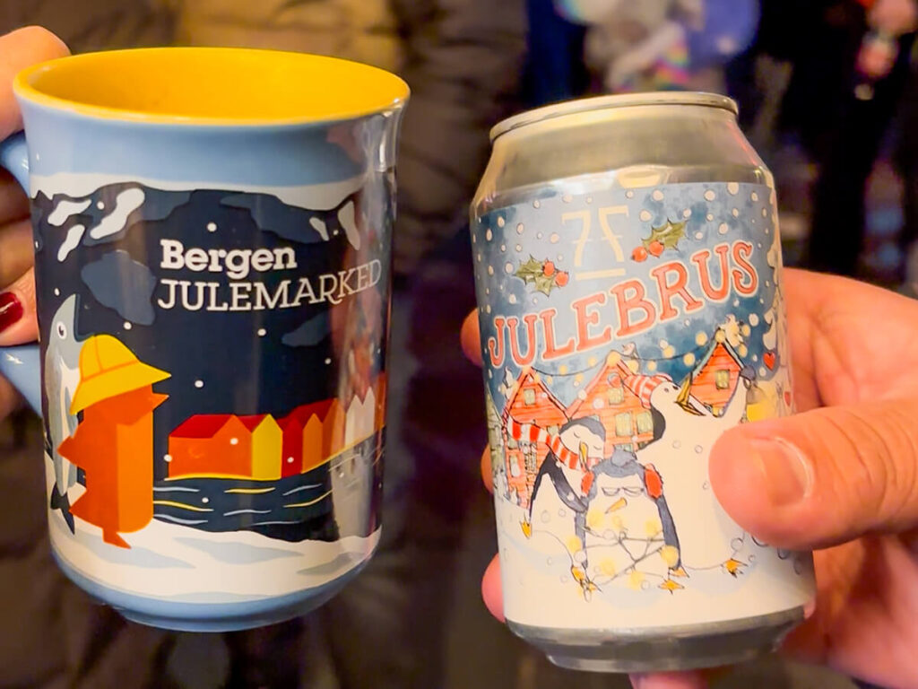If you don’t drink alcohol, the stalls also offer julebrus, a Norwegian Christmas soda that comes in a can and tastes very sweet with berry notes. This is what Cecilio ordered since he doesn’t drink. Julebrus is also a popular drink for children.